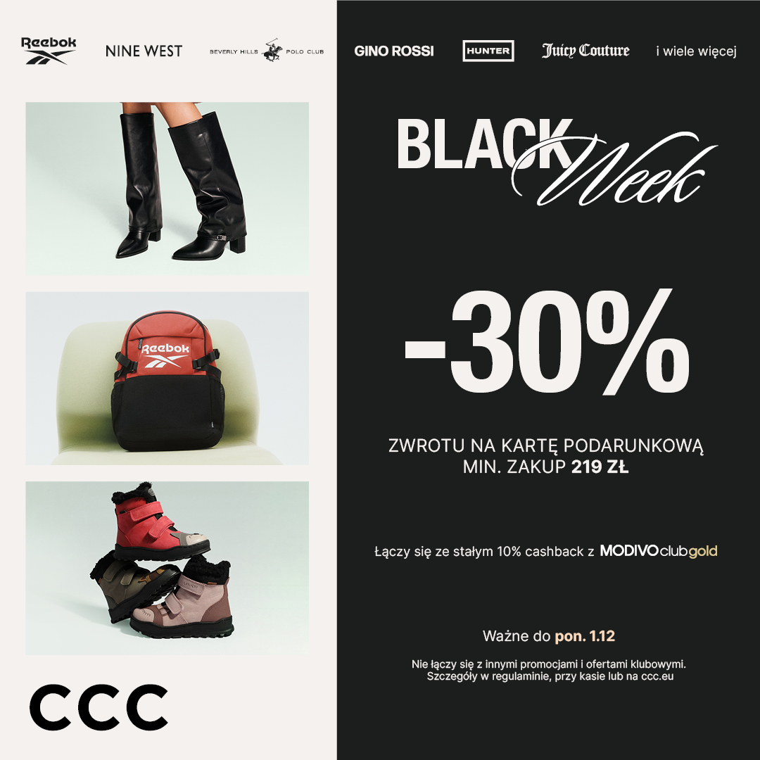28.11-01.12.2025 BLACK WEEK w CCC! Zyskaj 30% w sklepach stacjonarnych! Zrób zakupy za min. 219 zł i odbierz aż 30% zwrotu na kartę podarunkową. Kupuj buty i dodatki znanych marek w CCC. Oferta ważna w sklepach CCC TYLKO do 1 GRUDNIA. Szczegóły w regulaminie.